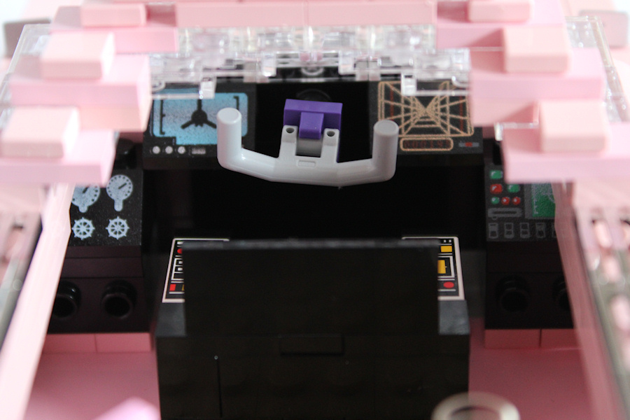 The canopy could be opened to show the very comfortable seat - no, hang on - it's more a kind of armchair, or couch and not just a seat. You might also discover the pink mp3 player (a bit ahead of the Thunderbird's time line, but it works so great at this place) and the drivers seat surrounded by all that fancy control elements for all the cool gadgets: Oil slick dispenser, grappling hooks, outriggers, ... Just the stuff for your daily needs.