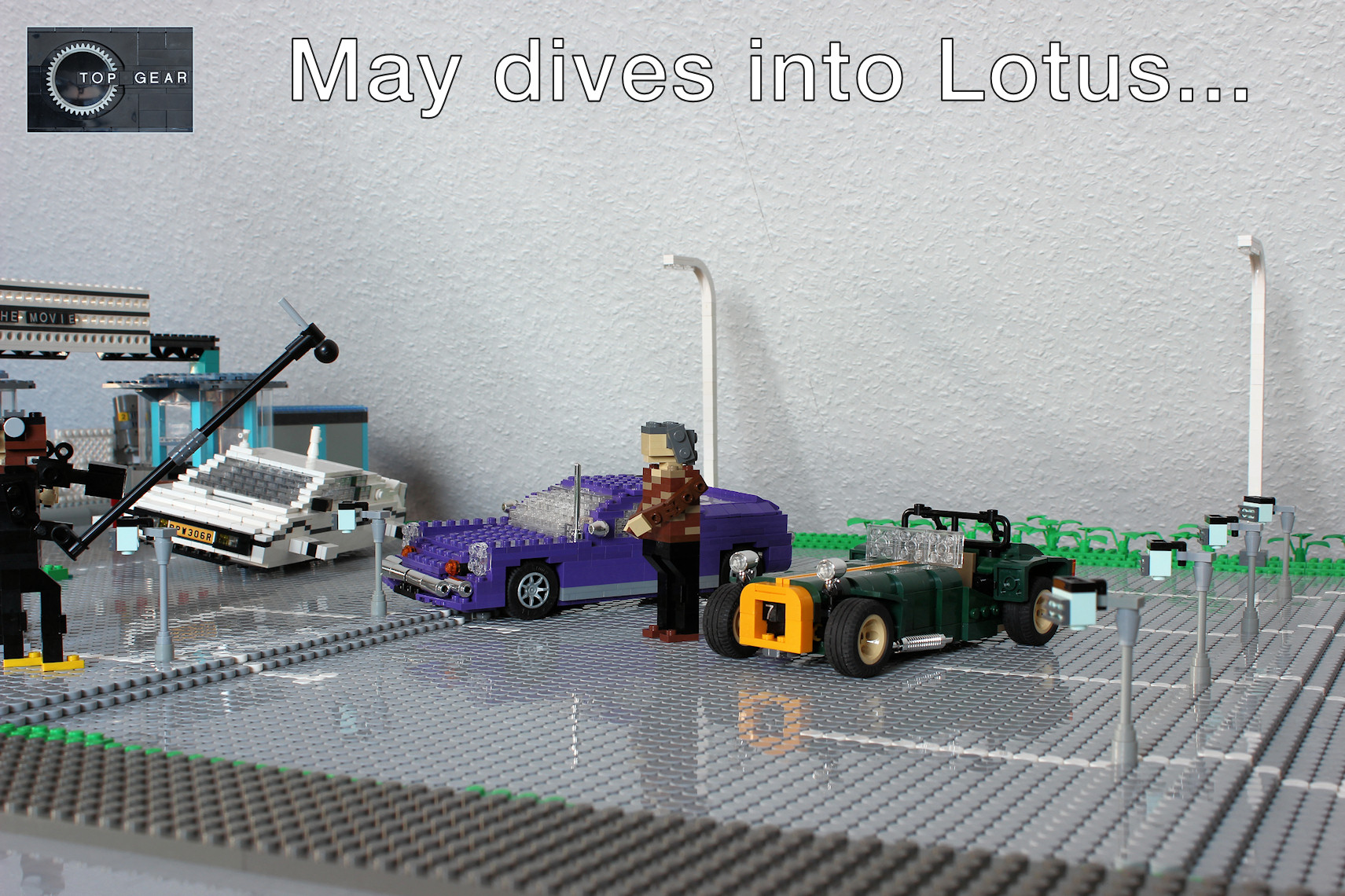 James May dives from Mr. Bond's Lotus Esprit, further to a purple Lotus Europa and deeper to a beautiful Lotus Super 7.