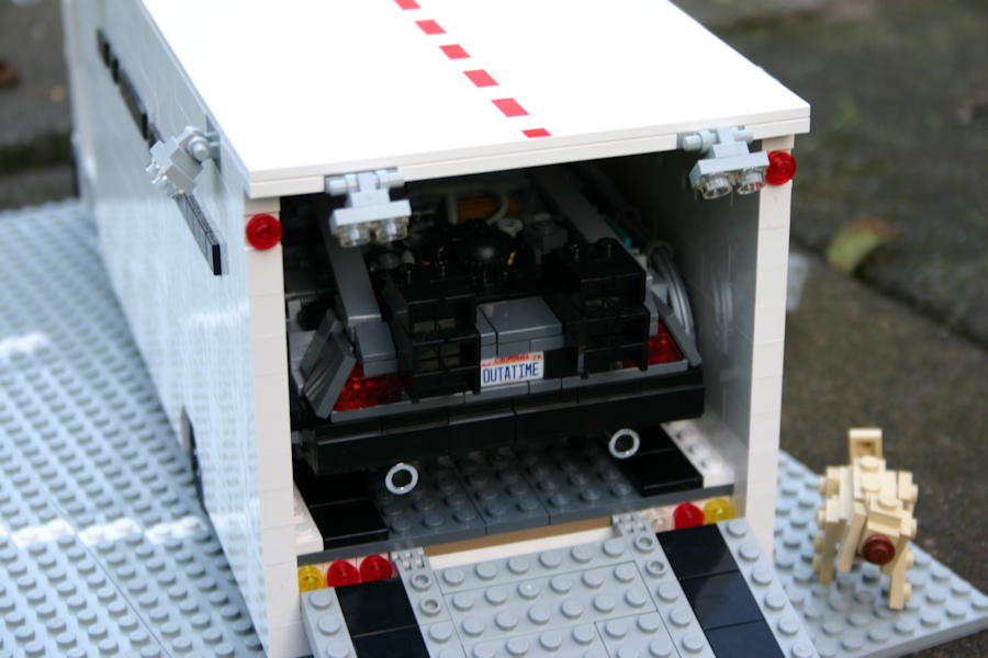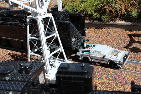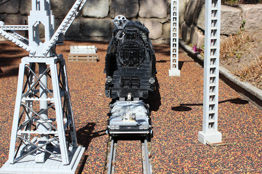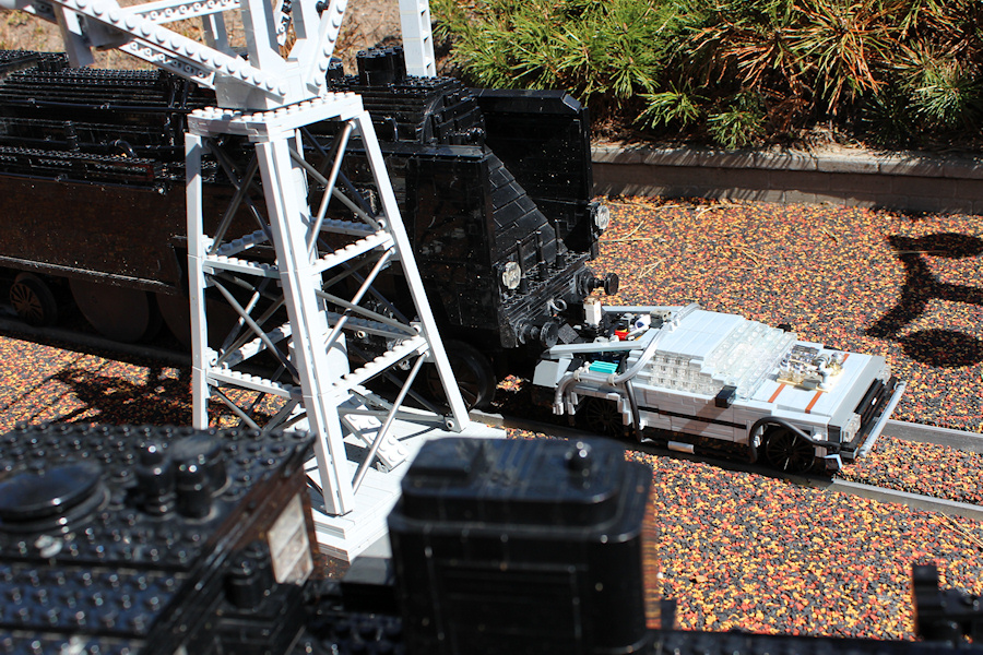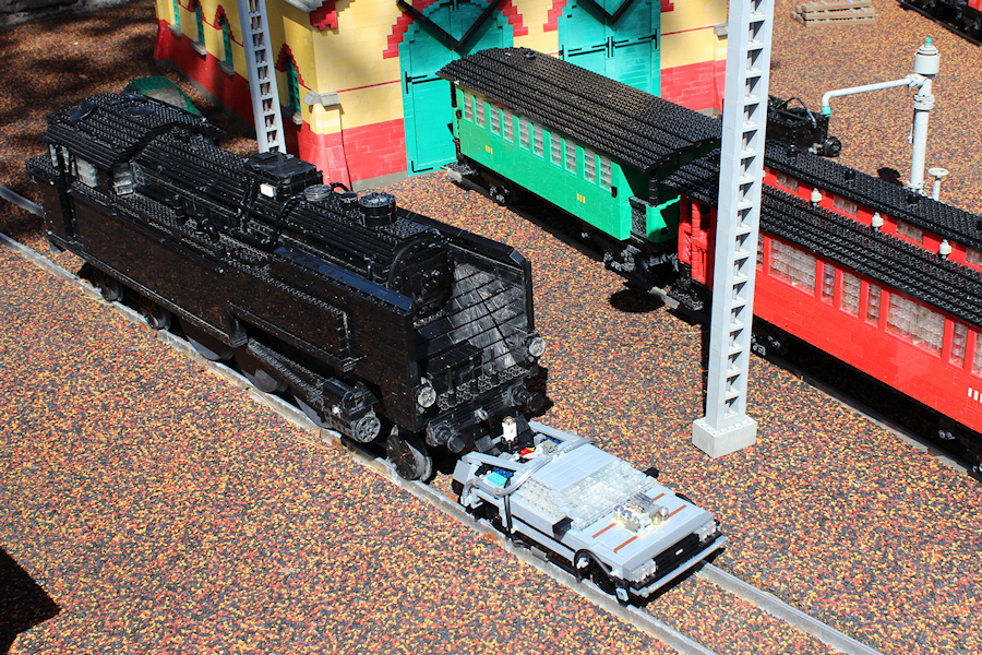 The train wheels of the DeLorean are fitting perfect on the miniland train tracks. The steam train is going back and forth and wasn't stopped for the photo session, so the DeLorean was really pushed by the train for a while.
